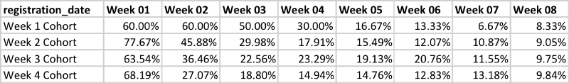 To measure the effectiveness of these efforts, we look closely at product survivial cohorts to measure the impact of specific actions to see how they impacted product survival over a period of time. Here’s an idea of what we look at (not our data…)
